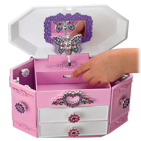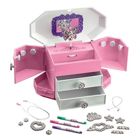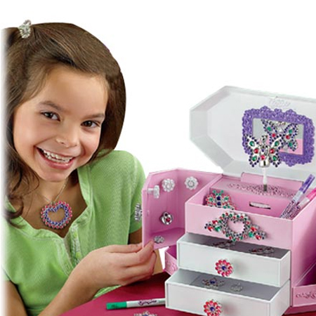 The color me gemz jewelry box allows your kids to use their imagination to create a box and jewelry set according to their taste. Aside from a necklace and bracelet, this jewelry box contains color me lid, spinning fairy gem, 8 peel and stick decorator gems, 2 jewelry storage drawers, heart-shaped necklace pendant, bracelet charm, bracelet string and 2 color me gemz pens. The color me pens will allow your kids to color the gems with their preferred one and create a jewelry set that suits perfectly with their personality and the box itself. The easy to use set is perfect for kids over 5 years old, however, parents should be careful with this box since chocking the small parts may be hazardous. [CLICK HERE to checkout Color Me Gemz Jewelry Box]