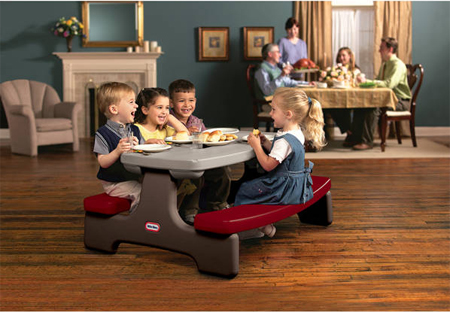 Little Tikes Endless Adventures Easy Store Table can perfectly be used for both indoor and outdoor and can be folded for easy storage and portability. The table comprises two rows of seats where up to 6 children can seat. The table has two cup holders and a condiment or crayon tray that can be used multi-purposely. The center contains a hole that can hold a regular sized umbrella. Setting up or taking down the table is very easy and no tools are required. The dimension of the table is 42.00″L x 38.00″W x 19.00″H and is ideal for use of 2 to 8 years old babies. [Click here to get more details on Little Tikes Endless Adventures Easy Store Table]