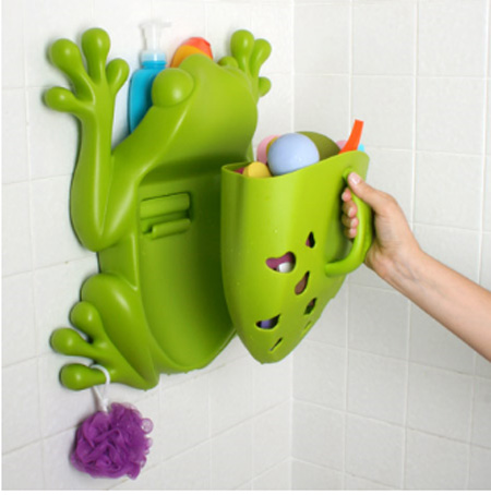 The Frog Pod, with its drainable scoop, provides great convenience for collecting and cleaning toys and is supported by a wall-mounted base and a built-in shelf that allows storing bath supplies. This pod attaches with adhesive strips to the bathtub wall semi-permanently and can be removed anytime without harming wall surfaces or bathroom tiles. Alternatively, it can be mounted with screws to any wall. The removable feature of the scoop from the base will enhance the convenience of using. The fingers and toes of the frog can be used to hang bath accessories and other decorative articles. [Frog Pod Order Info]