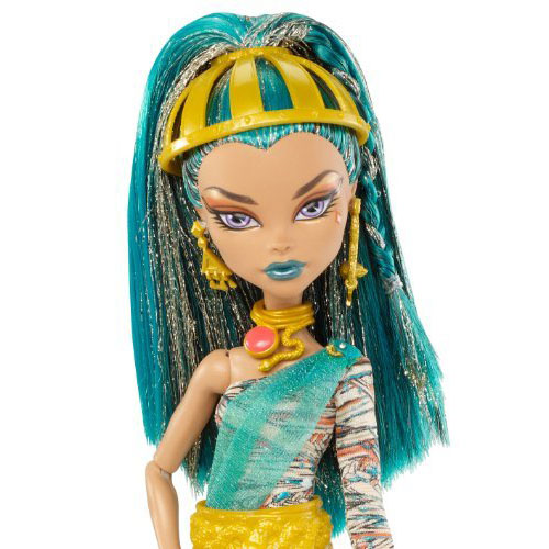 Monster High Nefera de Nile Doll features beautiful hairstyle, it boasts turquoise with strands of black and gold glitter. We also love the gold headpiece, it dramatizes her look very well. [Click here to get more information about Nefera de Nile Doll]
