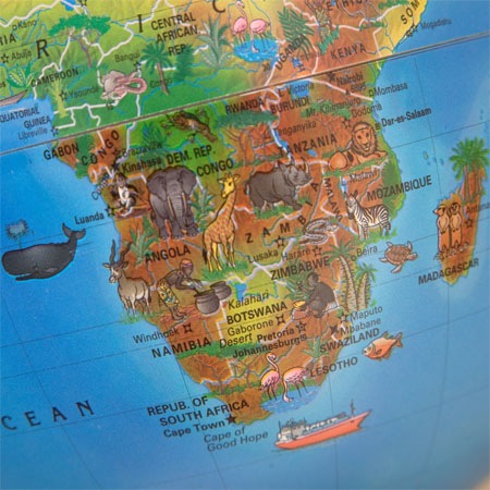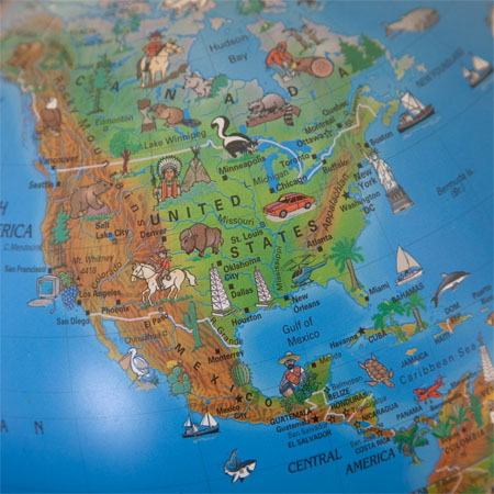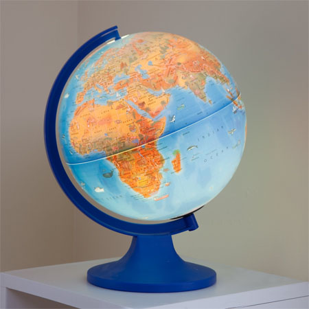 The 10-inch diameter tabletop globe can become one of the most exciting games to explore for your kids with its engaging features, colorful design and a pictorial representation of regions, countries and resources. This innovative globe contains true-to-life land masses that describe ecological landscapes against a classic blue ocean. The illumination of the globe along with the over 100 colorful images of various animals, produce, monuments and landmarks will help them learn geographical concepts with great pleasure. The globe has bee placed over a bright blue molded plastic base along with a matching plastic semi-meridian, making it a perfect piece for playrooms, classrooms or bedrooms. [Click Here to Get Tabletop Globe Order Info]