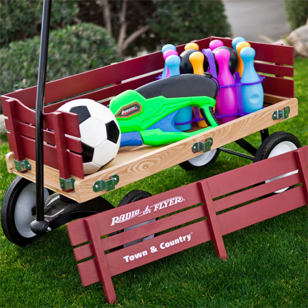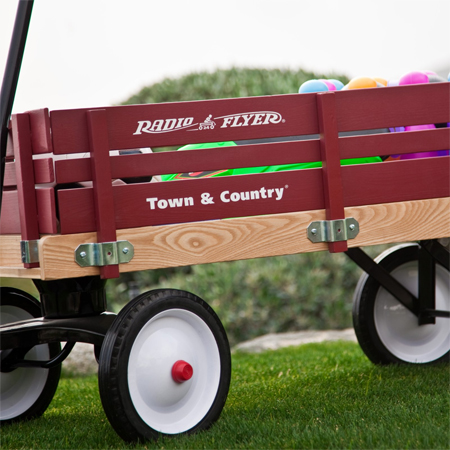 The town & country wagon offers ultimate functionality to carry your kid’s toys and other essentials, while the safe and adorable design creates a fabulous aesthetics during your family outings. The wagon is crafted of natural wood and features an extra large body. The bright red wood made sides gives extra support when your kids would like to ride inside the wagon and to ensure easy access, these sides can be removed if required. The 10 x 1.5 inches steel wheels are durable and contains real rubber tires that provides a cushioned and quite ride. Easy pulling has been ensured with the extra long handle, which can be folded under the wagon when placing it inside a car. [Click Here to get more details about this wagon]
